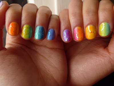 La dernière fois que j'avais fait cette technique de dégradé sur ongles pour former un arc-en-ciel, je n'étais pas 100% satisfaite car les couleurs n'étaient pas parfaitement fondues les unes avec les autres, de près ça se voyait.